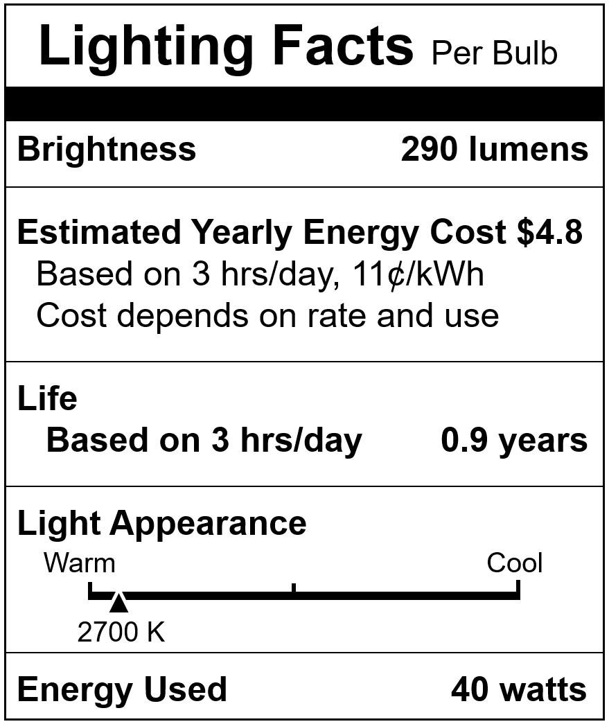 This incandescent light bulb takes 40W, giving 290 lumens of light. Assuming an average of 3 hours of daily operation and average cost of 11¢ per kW, the yearly energy cost is $4.8.