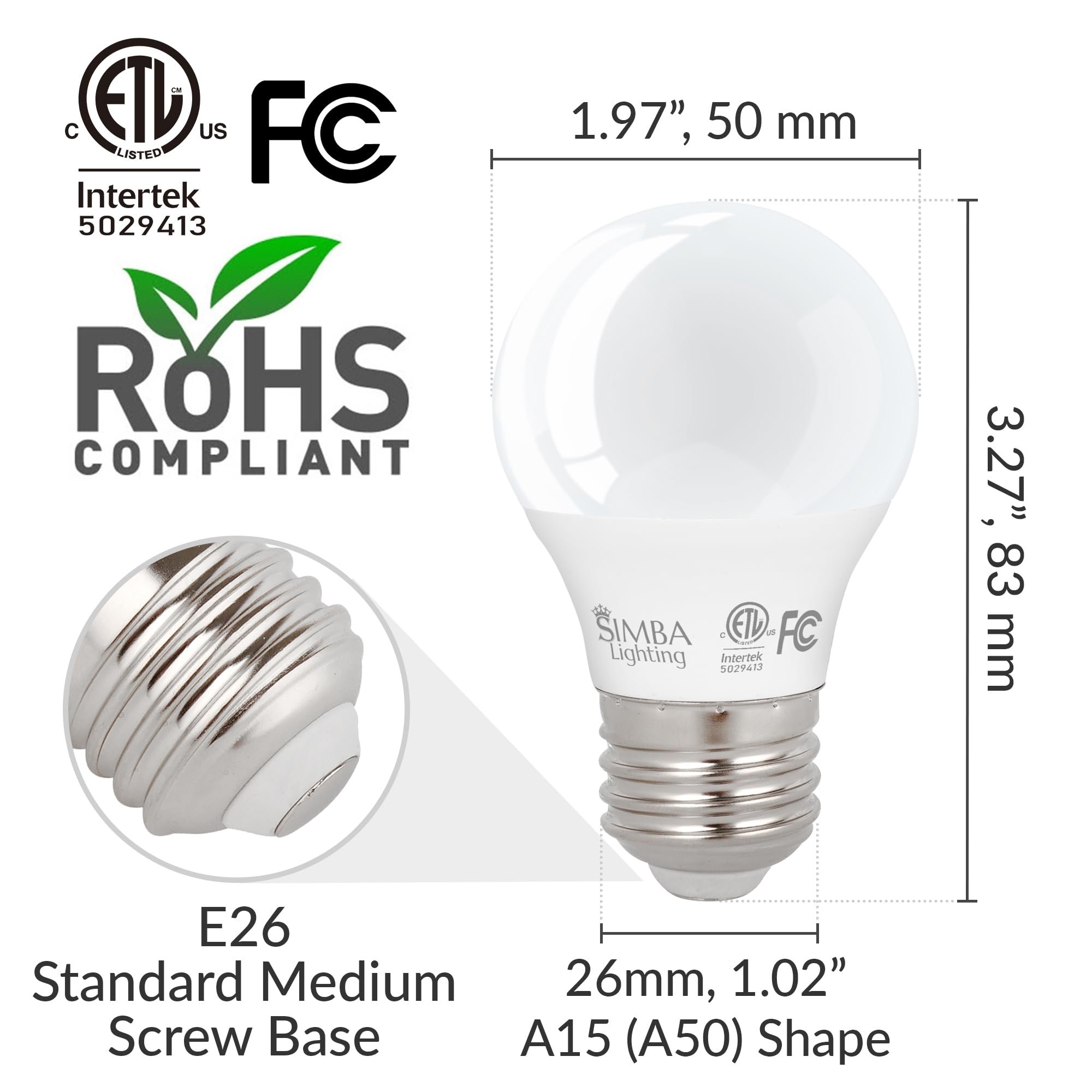 - Base: E26 Standard Medium Edison Screw (26mm or 1.02” diameter)