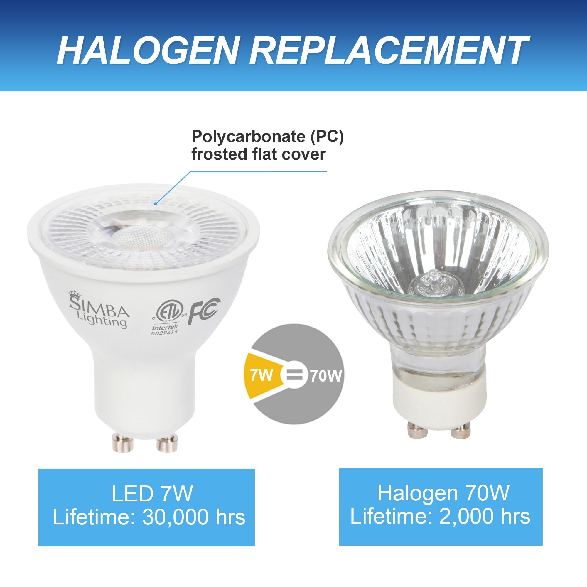 - Power: 7W, 70W halogen equivalent