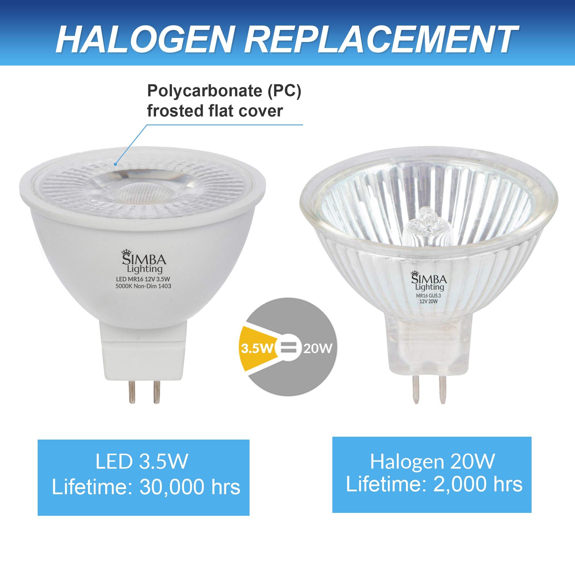 The Simba Lighting® high output MR16 12V spotlight bulb is an excellent addition to your home, office, art gallery, museums, restaurants, retail shops, etc. Often used for indoor and outdoor accent lighting, landscape, track lighting, fiber optics, desk and floor lamps. Equipped with high quality SMD LEDs, this light bulb provides a narrow spotlight with a 38° beam angle.